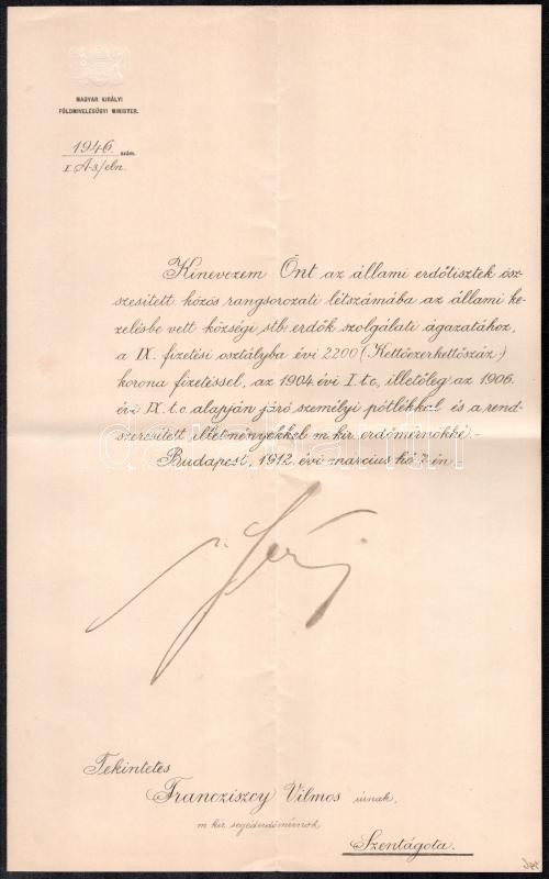 Beschreibung: 1912 Erdőtiszti kinevezés, Serényi Béla (1866-1919) földművelésügyi miniszter (második Khuen-Héderváry-kormány, 1910-1912), fejléces papíron.