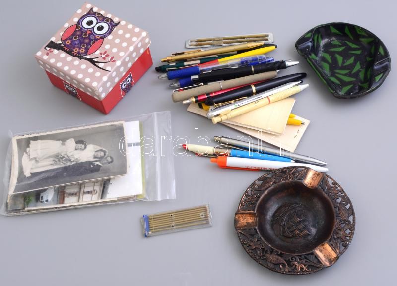 Beschreibung: Vegyes bolha tétel, bizsuk, képeslapok, fotók, 2 db hamutál, bőr tárca, írószerek....változó állapotban.