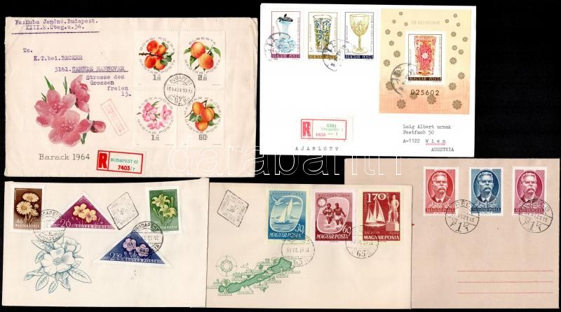 Beschreibung: Kis küldemény tétel, benne 87 db levél, FDC, ajánlott, ajánlott expressz küldemény, sorokkal, blokkokkal bérmentesítve 1950-től