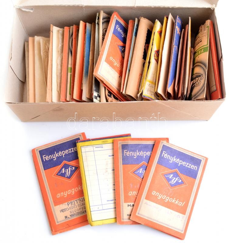 CipÅ‘sdoboznyi fotós tasak, benne üveg és celluloid negatÃvok, kidolhozott képek, klf laborokból (Pjetsik, Droppa, SebÅ‘k, Vadász, Orosz Nóra, stb) 1930-1960 közöttrÅ‘l. Érdekes fotótörténeti anyag. kb 50 db