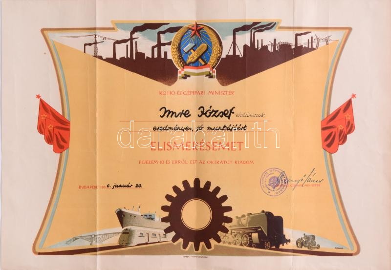 1956 Látványos kohó- és gépipari miniszteri elismerő oklevél Csergő Já... https://www.darabanth.com/de/389-Fernauktion/389.0/Kunst-Dokumente-andere-Sammelgebiete/Dokument~18/1956-Latvanyos-koho-es-gepipari-miniszteri-elismero-oklevel-Csergo-Janos-1920-1980-minis~II2341233