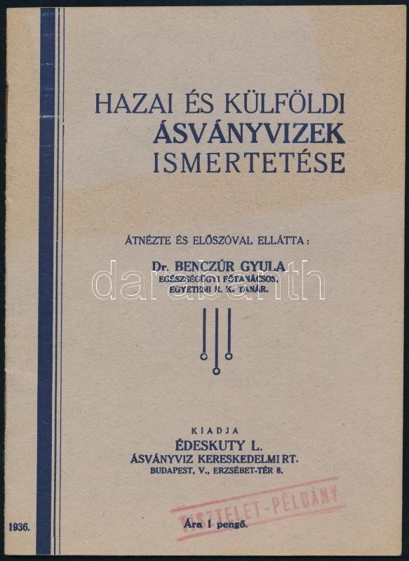 1936 Hazai és külföldi ásványvizek ismertetése. Átnézte és előszóval ellátta: Dr. Benczúr Gyula. Kiadja: Édeskuty L. Ásványvíz kereskedelmi Rt. Képes reklámnyomtatvány 16p.