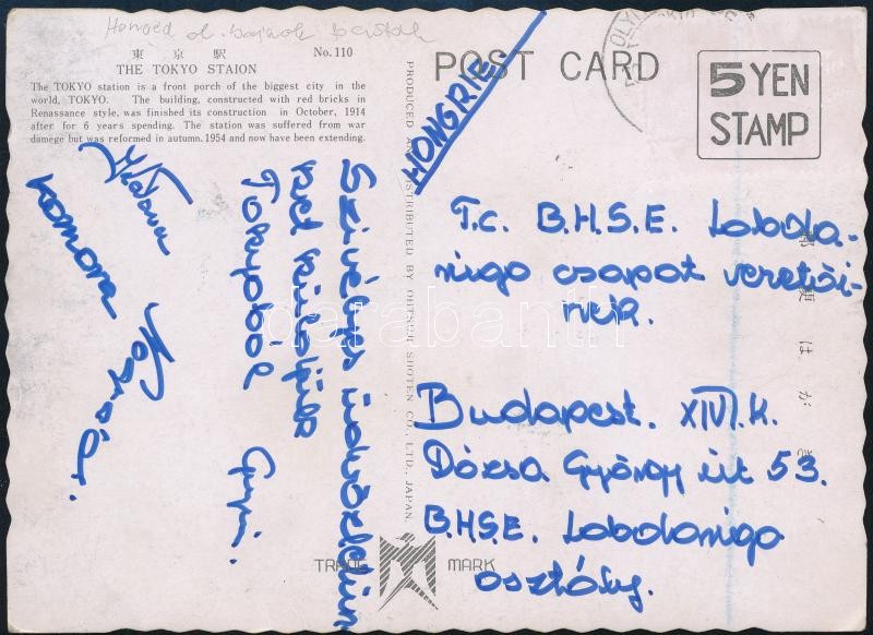 Beschreibung: Honvéd olimpiai bajnok focisták aláírása Tokióból hazaküldött képeslapon (Katona, Komora, Nógrádi)