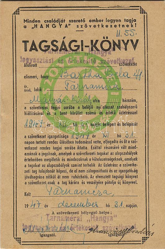 Hangya tagsági könyv 1947 https://www.darabanth.com/de/39-Fernauktion/39.0/Andere-Sammelgebiete/~213/Hangya-tagsagi-konyv-1947~II75543