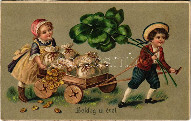 1920 Boldog új évet. Kisgyerekek pénzes kocsival. Dombornyomott litho ... https://www.darabanth.com/de/39-Gross-Auktion/39.1/Ansichtskarten/GruC39Fkarten-Feste~16126/1920-Boldog-uj-evet-Kisgyerekek-penzes-kocsival-Dombornyomott-litho-New-Year-greeting-childr~II2731309