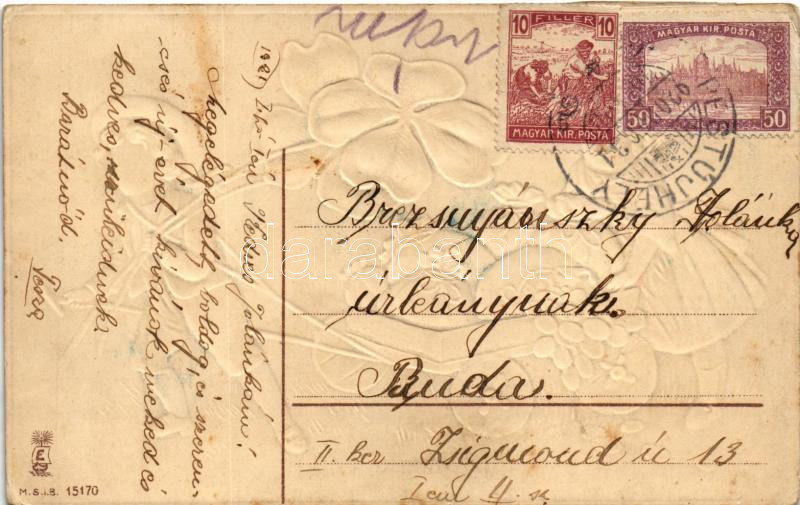 Beschreibung: 1920 Boldog új évet. Kisgyerekek pénzes kocsival. Dombornyomott litho / New Year greeting, children with money cart. MM.S. i. B. 15170. Art Nouveau, embossed, litho (EK)