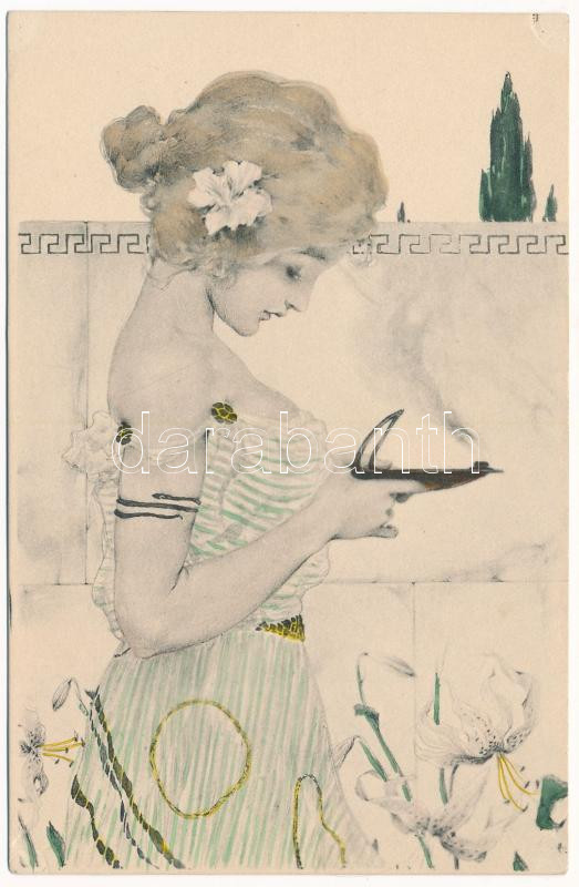 Greek Virgin. Art Nouveau, M.M. Vienne, unsigned Raphael Kirchner https://www.darabanth.com/de/39-Gross-Auktion/39.1/Ansichtskarten/Kunstlerkarten~16101/Greek-Virgin-Art-Nouveau-MM-Vienne-unsigned-Raphael-Kirchner~II2741975