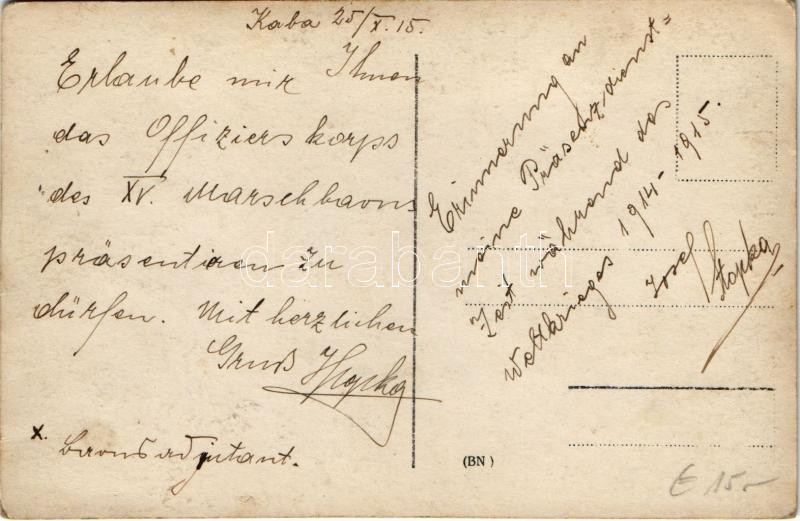 1915 Kaba, K.u.k. Offizierskorps des XV. Marschbaons / Cs. és kir. 15.... https://www.darabanth.com/de/39-Gross-Auktion/39.1/Ansichtskarten/Militaria~16087/1915-Kaba-Kuk-Offizierskorps-des-XV-Marschbaons-Cs-es-kir-15-zaszloalj-tisztikara-WW~II2738481