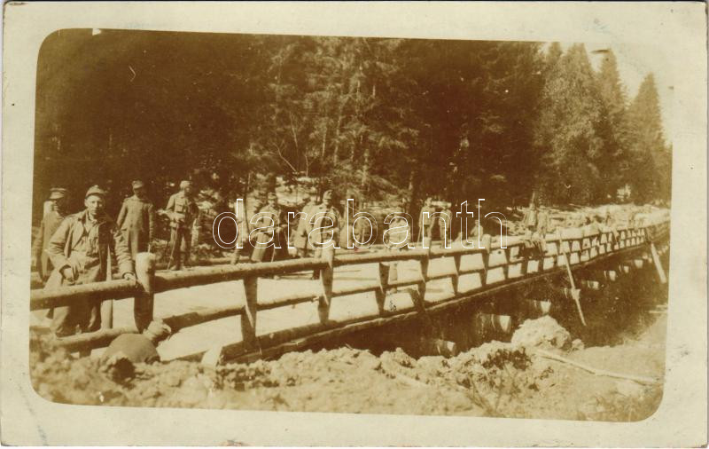 1917 Első világháborús osztrák-magyar katonai építőcsapat, Zawojból Pozsieczbe vezető úton egy állványhíd építése 60 méter hosszan, mely a Generális nevére lett felavatva (Nöring) / WWI Austro-Hungarian K.u.k. military road and bridge construction, soldiers. photo (fl)