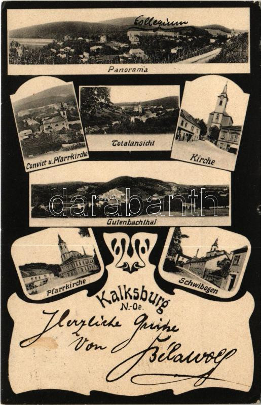 Beschreibung: 1905 Wien, Vienna, Bécs XXIII. Kalksburg, Panorama, Convict und Pfarrkirche, Kirche, Gutenbachthal, Schwibogen. Art Nouveau