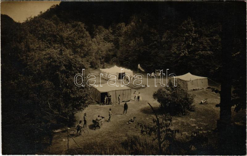 Beschreibung: 1923 Diósgyőr, cserkész tábor + "100. sz. Wekerle cserkészcsapat Kispest Wekerle-Munkástelep 1921" bélyegzés / Hungarian scout camp. photo