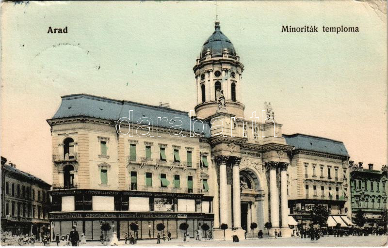 1906 Arad, Minoriták temploma, Deutsch Testvérek központi divatáruháza... https://www.darabanth.com/de/39-Gross-Auktion/39.1/Ansichtskarten/Siebenburgen~16041/1906-Arad-Minoritak-temploma-Deutsch-Testverek-kozponti-divataruhaza-Turul-cipogyar-rt-N~II2715548