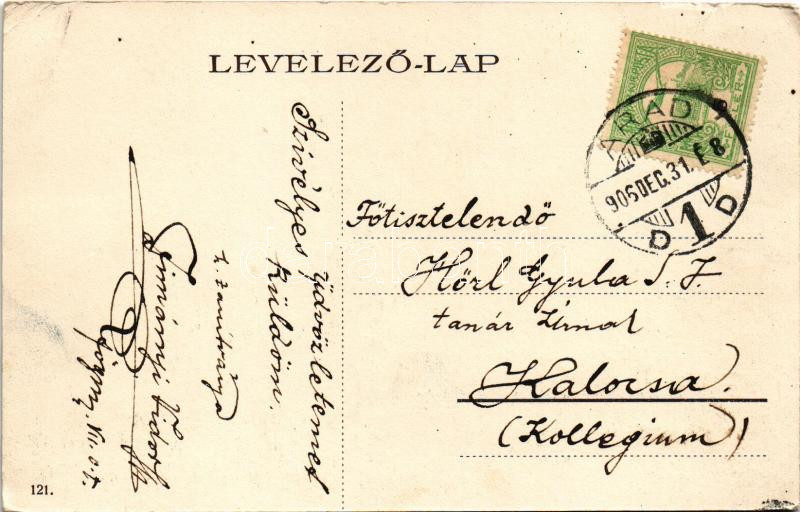 Beschreibung: 1906 Arad, Minoriták temploma, Deutsch Testvérek központi divatáruháza, Turul cipőgyár rt., Náder J. és Scherhagh és Fia üzlete / church, shops (EK)