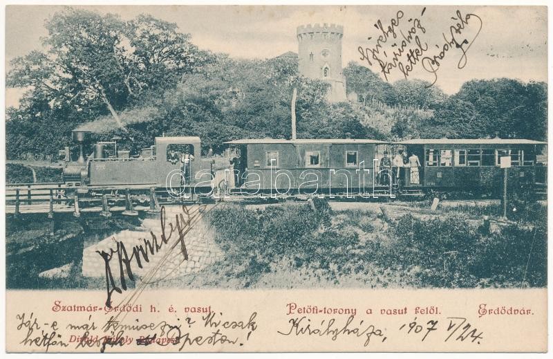1907 Erdőd, Károlyierdőd, Ardud (Szatmár); Szatmár-Erdődi h.é. vasút, Petőfi torony, gőzmozdony, vonat, keskeny nyomtávú kisvasút. Divald Károly (A helyiek kávéfőzőnek, de többnyire Zsuzsinak hívták) / castle tower, narrow-gauge railway, locomotive, train (locals called it "Zsuzsi")