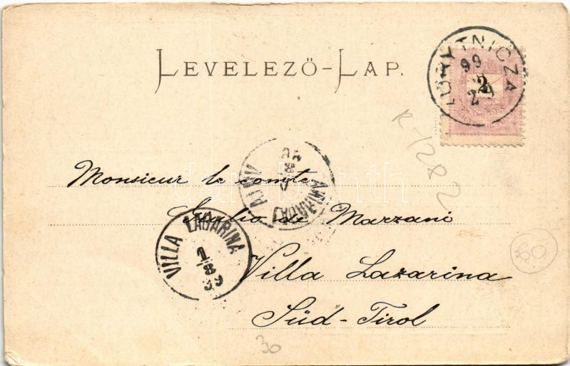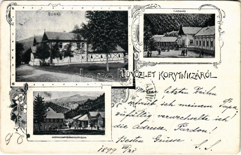 Beschreibung: 1899 (Vorläufer) Koritnyica, Korytnica; Duna nyaraló, fürdőház, fürdő nyugati oldala / villa, spa, bath. Art Nouveau, floral (fa)