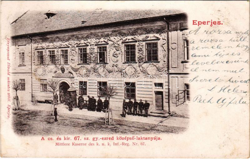 1901 Eperjes, Presov; A cs. és kir. 67. sz. gyalogezred középső laktanyája. Divald / Mittlere Kaserne des K.u.k. Inf.-Reg. Nr. 67 / Austro-Hungarian military infantry barracks (fl)