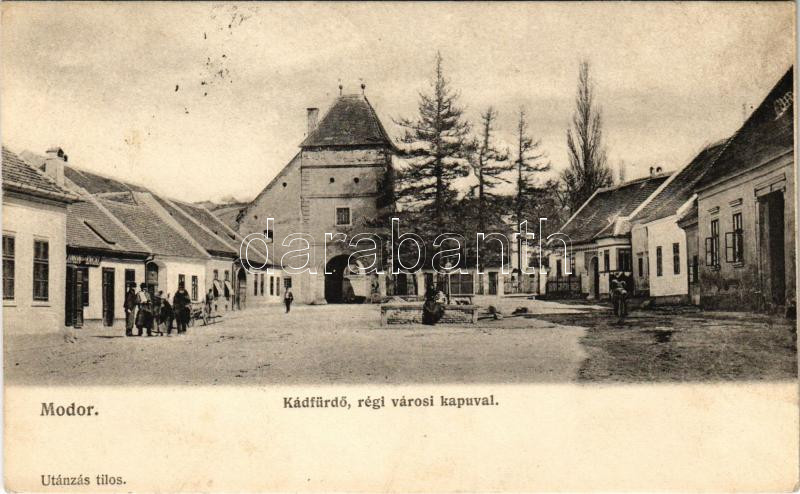 Beschreibung: 1907 Modor, Modra; Kádfürdő, régi városkapu, Solomon és Engel üzlete / spa, old castle gate, shop