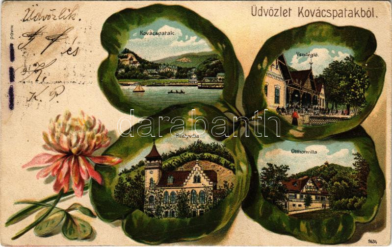 Beschreibung: 1911 Kovácspatak, Kovacov; Vendéglő, Rédly és Otthon villa, Duna. Dombornyomott szecessziós lóhere montázs / restaurant, villas, Danube river. Art Nouveau, embossed clover litho (EK)