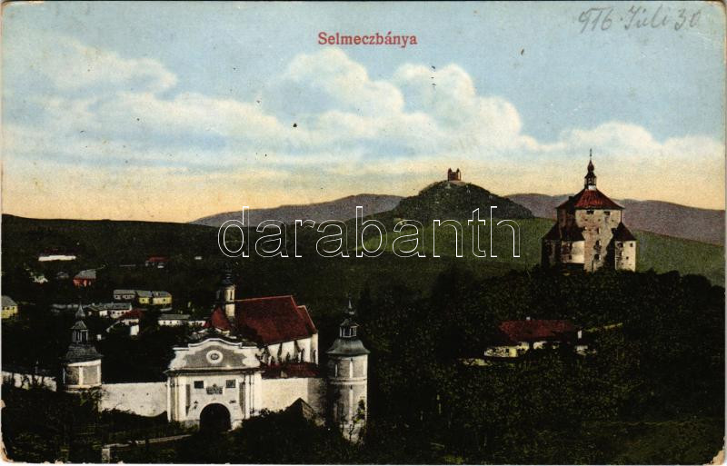 1916 Selmecbánya, Schemnitz, Banská Stiavnica; Piargská brána, Novy zámok, Kalvária / Hegybányai (Szélaknai) kapu, Piargi kapu, Leányvár, Kálvária. Joerges A. kiadása / city gate, castle, calvary + "Városi kórház Selmecbánya" (EK)