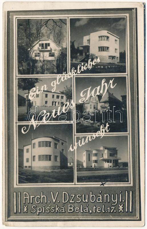 1936 Szepesbéla, Spisská Belá (Szepes, Zips); Dzsubányi V. építész újévi üdvözlete az általa tervezett házakkal, reklám / New Year greetings and advertisement of architect V. Dzsubányi (ragasztónyom / gluemark)