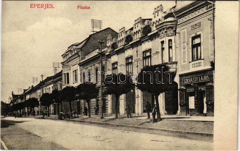 Beschreibung: Eperjes, Presov; Fő utca, Szilvássy Lajos üzlete. Divald Kárely fia / main street, shops
