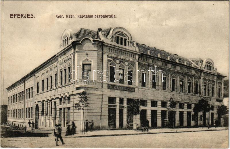 Eperjes, Presov; Görögkatolikus káptalan bérpalotája, Trosztler Kálmán üzlete. Divald Károly fia / palace of the Greek Catholic Cathedral chapter, shop