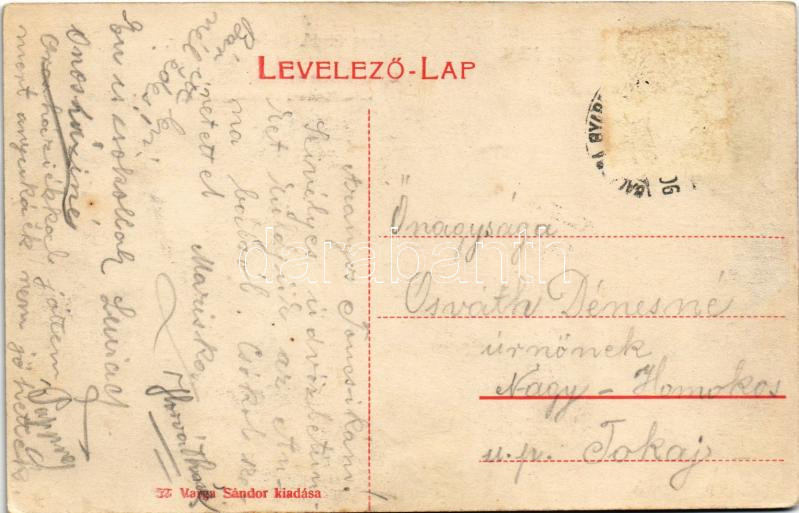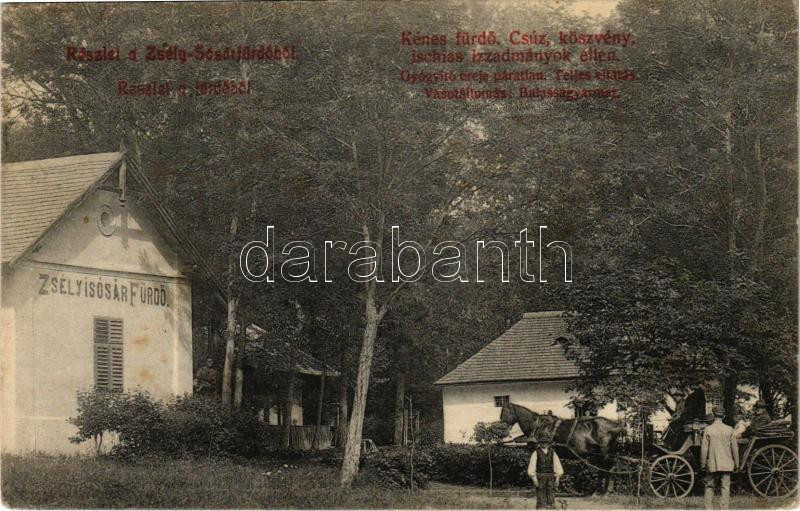 Beschreibung: Zsély, Zelovce; Sósár gyógyfürdő. Részlet a fürdőből. Kénes fürdő. Csúz, köszvény, ischias izzadmányok ellen. Varga Sándor kiadása / Sosárske Lázne / spa, bath, horse-drawn carriage (fl)
