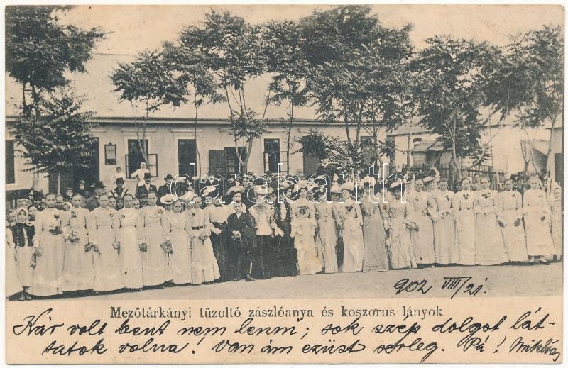 1902 Mezőtárkány, Mezőtárkányi tűzoltó zászlóanya és koszorús lányok https://www.darabanth.com/de/39-Gross-Auktion/39.1/Ansichtskarten/Ungarn~16040/1902-Mezotarkany-Mezotarkanyi-tuzolto-zaszloanya-es-koszorus-lanyok~II2724264