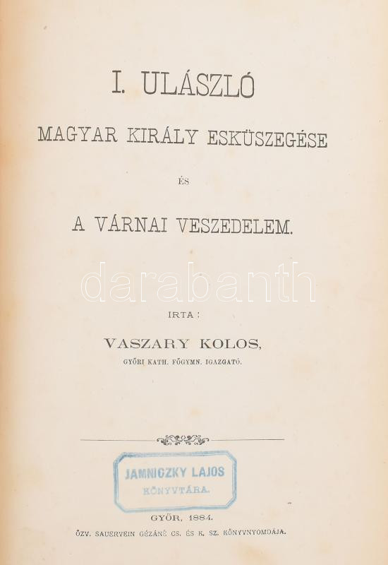 Vaszary Kolos: I. Ulászló magyar király esküszegése és a várnai veszedelem. Győr, 1884, özv. Sauervein Gézáné, (2)+204 p. Korabeli dombornyomott egészvászon-kötésben, díszes, aranyozott gerinccel, aranyozott lapélekkel, a gerincen kisebb kopásnyomokkal, néhány kissé foltos lappal, egyébként jó állapotban, tulajdonosi bélyegzővel.
