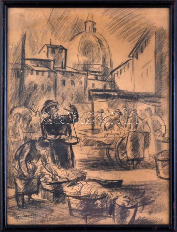Deli Antal (1886-1960): Firenzei piac, 1926. Szén, papír. Jelezve balra lent. Üvegezett fa keretben. 46×34 cm / Antal Deli (1886-1960): Market in Firenze, 1926. Charcoal on paper. Signed lower left. Framed. 46×34 cm