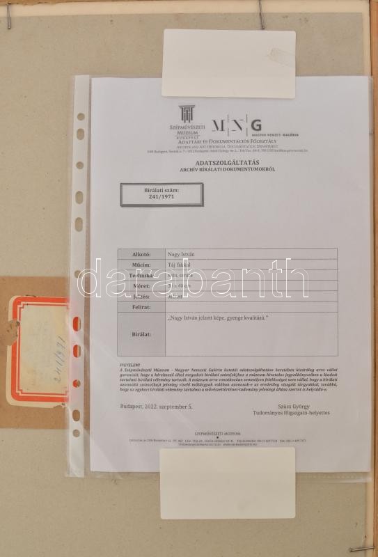 Nagy István (1873-1937): Táj fákkal. Akvarell, szén, pasztellkréta, papír. Jelezve jobbra lent. Hátoldalán Magyar Nemzeti Galéria 241/971 bírálati számával ellátott címke. A bírálat megerősíti az aukciónkon szereplő tétel eredetiségét, bírálat csatolva a tételhez. Üvegezett fakeretben. 26x40 cm / István Nagy (1873-1937): Landscape with trees. Watercolour and coal on paper, signed lower right. With Hungarian National Gallery jury label no. 241/971 on the reverse. The jury confirmed that the drawing is István Nagy's work. framed
