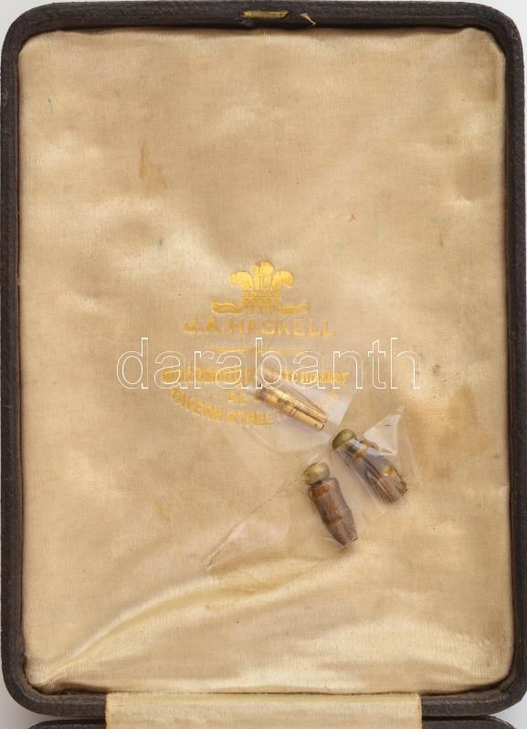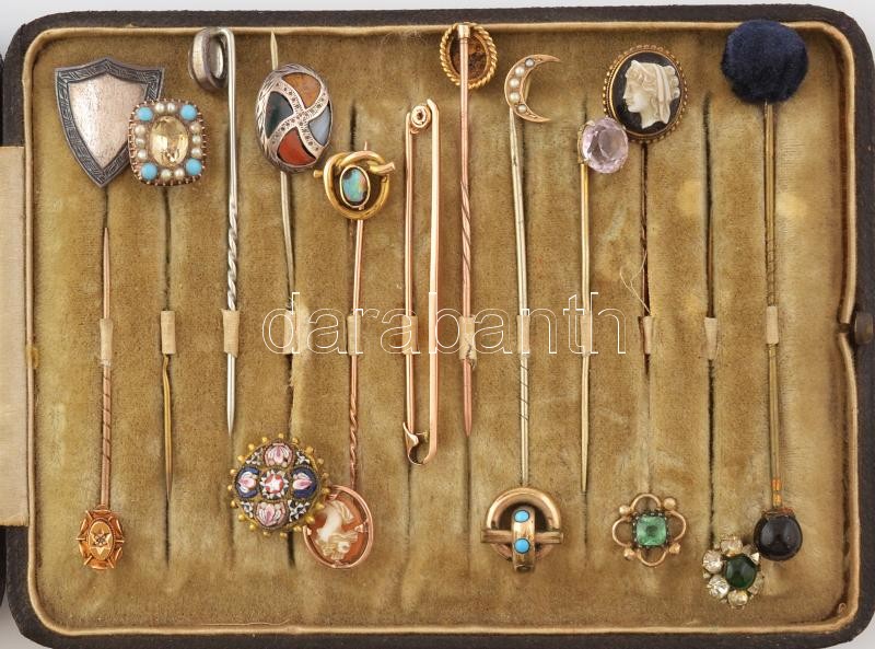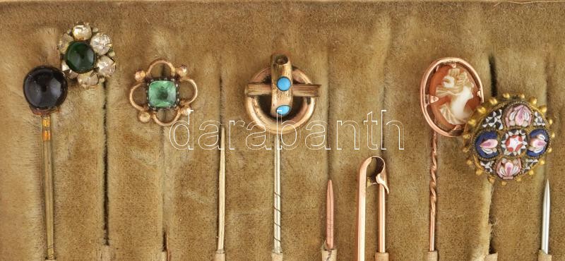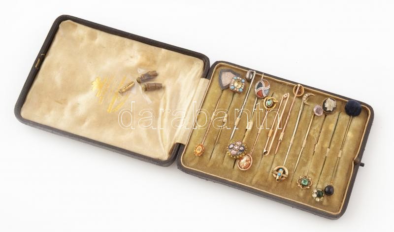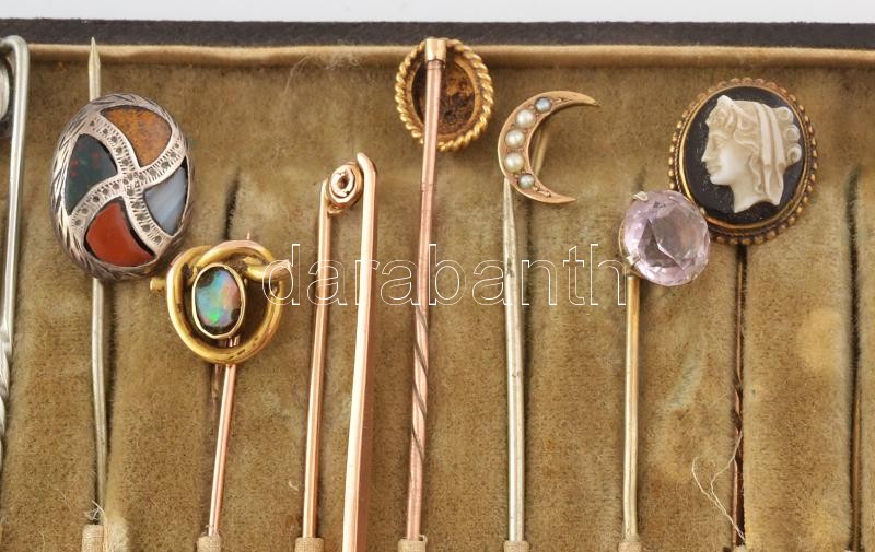 Nyakkendőtű, bross gyűjtemény a XIX. sz-ból: közötte arany, nagyrészt 8K, de 14K is, brill darabokkal ékített, kámeás. Korabeli, jelzett tartóban / Collection of tie pins and broches. Among them: gold, diamonds, etc.