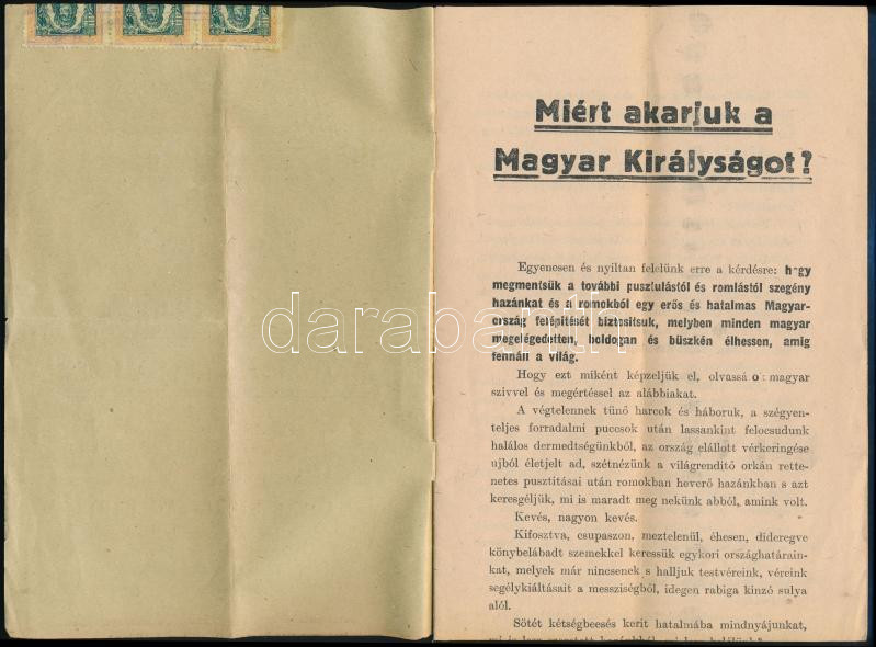 1920 Miért akarjuk a magyar királyságot? A Magyar Királyság Pártjának ... https://www.darabanth.com/de/39-Gross-Auktion/39.1/Kunst-Skulpturen-Historische-Dokumenten/Drucksachen~16044/1920-Miert-akarjuk-a-magyar-kiralysagot-A-Magyar-Kiralysag-Partjanak-16-oldalas-nyomtatvan~II2739883