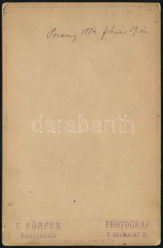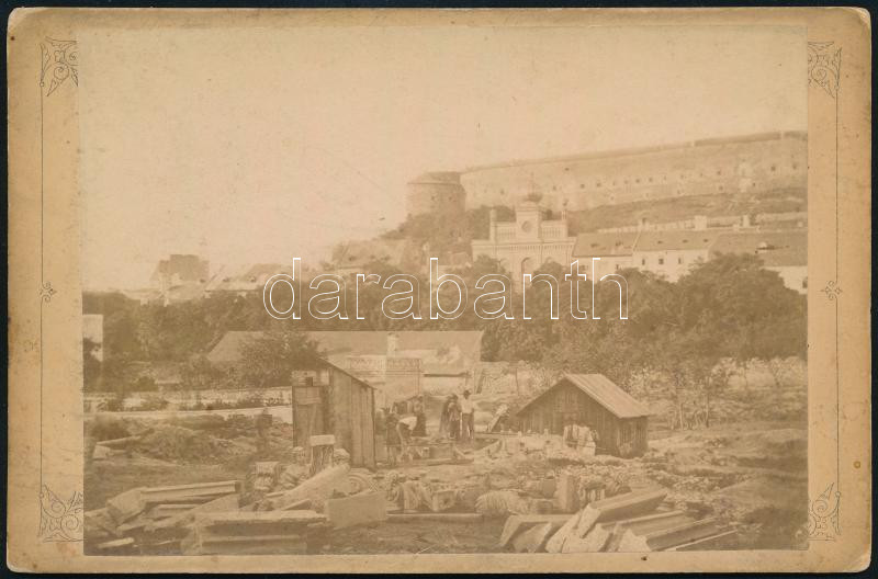 Beschreibung: 1884 Pozsony látképe az előtérben az ortodox zsinagógával, keményhátú fotó G. Körper pozsonyi műterméből, a hátoldalán dátumozva, 11x17 cm