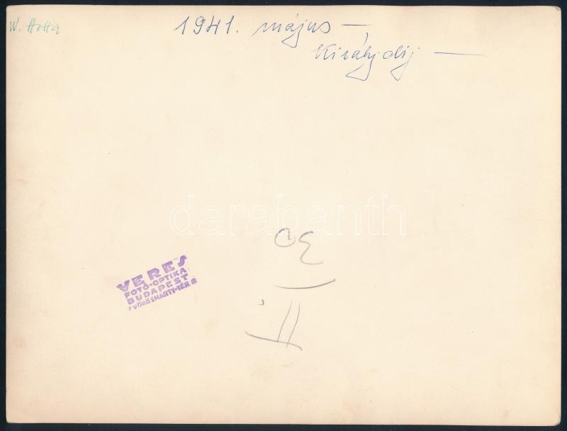 Wenckheim Henriette grófnő (,,Hetta", 1919-1985) két egyenruhás katona társaságában a lóversenypályán a Király-díjon, hátoldalán feliratozott vintage fotó 1941. május datálással, pecséttel jelzett (Veres Fotó-optika Bp., Vörösmarty tér 6.), 18x24 cm