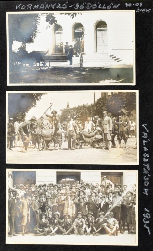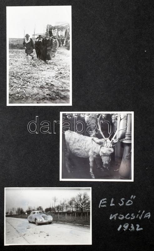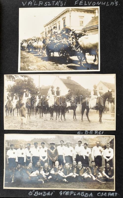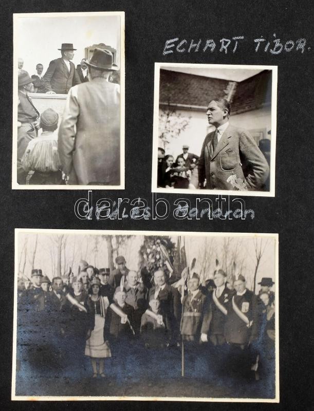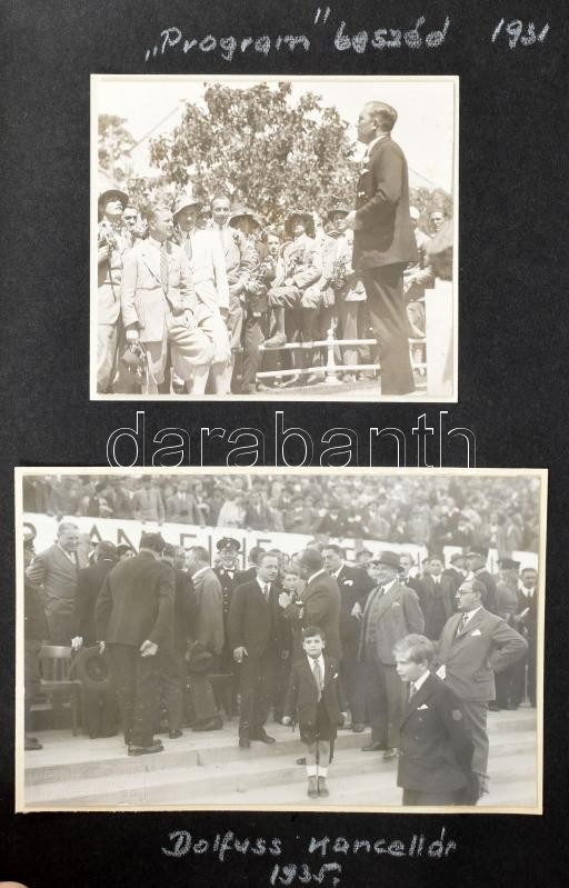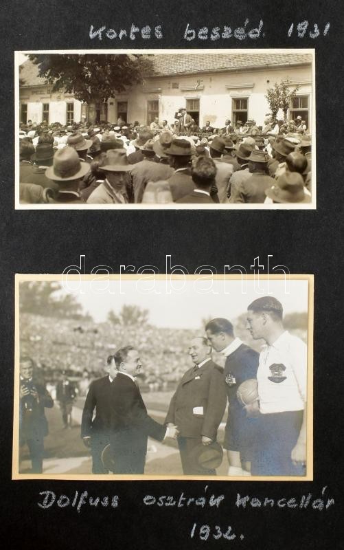cca 1920-1940 Dinnyés Lajos (1901-1961) kisgazda politikus, országgyűlési képviselő, későbbi miniszterelnök fotóalbuma, benne családi, közéleti és sport események fotóival, kb. 75 db fotóval, családtag által feliratozva, benne Kánya Kálmán, óbudai gyeplabda csapat, távolról Horthy Miklós, választási kortes beszédek és mókázós csoportképek, túra és kirándulás képes, keszthelyi egyetemi csoportkép, Dolfuss kancellár, Eckhart Tibor, a dabasi "Gentry" zenekar, Fradi meccs, ...stb. Kissé kopott vászon fotómappában, különféle méretben, változó, de nagyrészt jó állapotban.