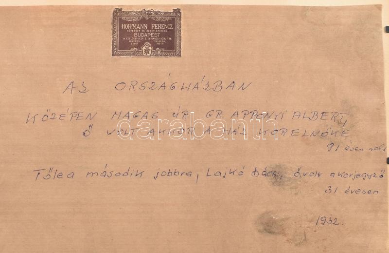 1932 Országházi fotó, rajta gr Apponyi Albert, gr. Apponyi György, Dinnyés Lajos korjegyző és más országgyűlési képviselők mindegyikőjük autográf aláírásával 22x17 cm Üvegezett keretben