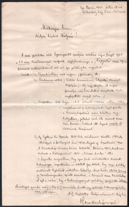 1935 Kerekesházy József (1912-2003) író, történész saját kézzel írt levele, aláírásával, 1 beírt oldal, 2 sztl. lev.