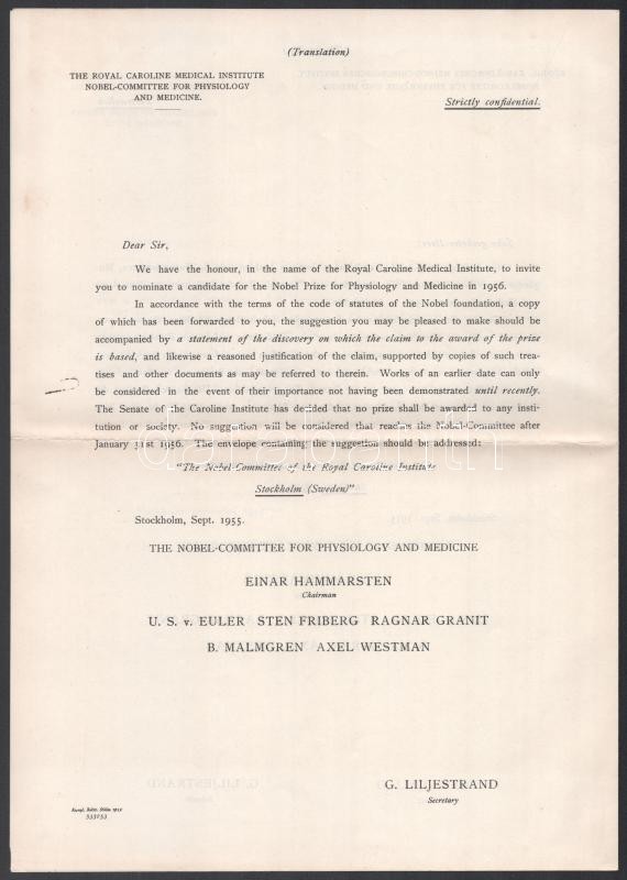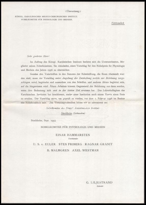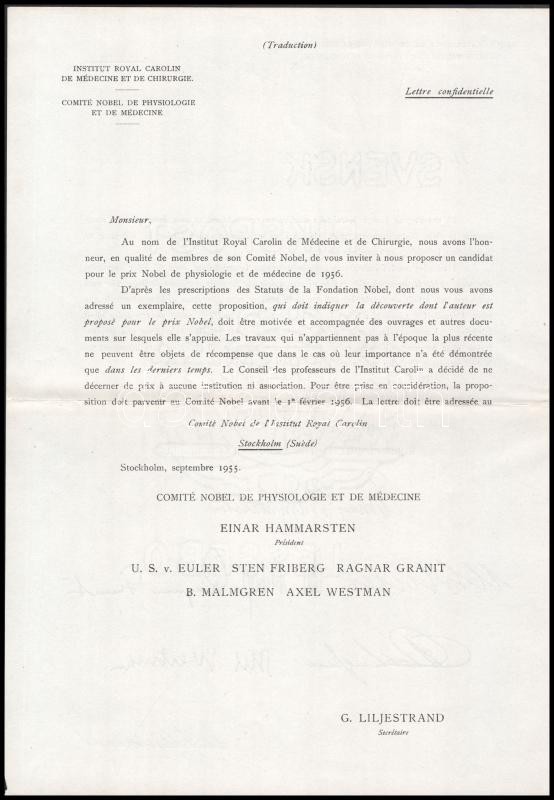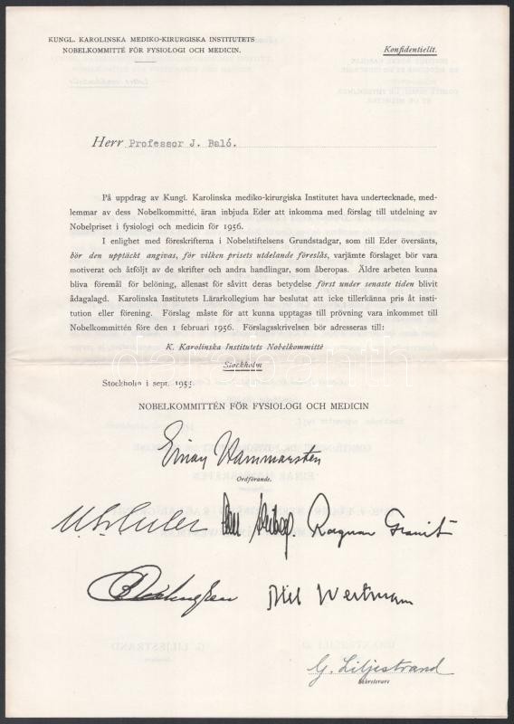 1955 Stockholm, a Karolinska Institutet (Karolinska Intézet, régebben Svéd Királyi Orvostudományi Egyetem; az orvosi Nobel-bizottság szerepét ellátó intézmény) levele Dr. Baló József (1895-1979) Kossuth-díjas orvos, patológus, az MTA tagja részére, amelyben felkérik, hogy ajánljon egy jelöltet az 1956. évi orvosi Nobel-díjra. Négy nyelven (angol, német, francia, svéd), az utolsó oldalon az orvosi Nobel-bizottság tagjainak nyomtatott aláírásaival, illetve Göran Liljestrand (1886-1968) svéd farmakológus, a Karolinska Institut titkárának saját kezű aláírásával. (Dr. Baló József jelöltje Dr. Jancsó Miklós (1903-1966) Kossuth-díjas farmakológus, hisztokémikus, fiziológus volt, a díjat azonban megosztva André Frédéric Cournand, Werner Forßmann és Dickinson W. Richards nyerte.) / Stockholm, letter from the Karolinska Institutet (Royal Caroline Institute, the Nobel-Comittee for Phsysiology and Medicine) to Dr. József Baló (1895-1979) Hungarian M.D., pathologist, Kossuth Prize winner, inviting him to nominate a candidate for the 1956 Nobel Prize for Pshysiology and Medicine. In four languages (English, German, French, Swedish), with printed signatures of the members of the Nobel-Comittee for Phsysiology and Medicine, and autograph signature of Göran Liljestrand (1886-1968) Swedish pharmacologist, secretary of the Karolinska Institutet, on the last page. (Dr. Baló nominated Dr. Miklós Jancsó (1903-1966), but in the end the prize was shared by André Frédéric Cournand, Werner Forßmann and Dickinson W. Richards.)