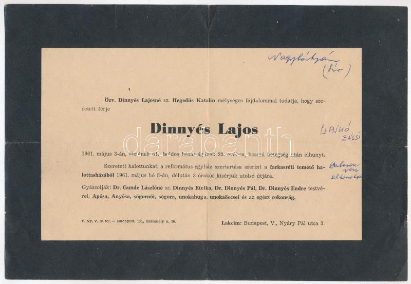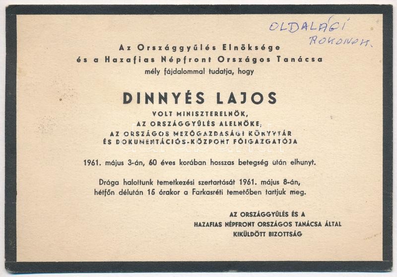 Beschreibung: 1961 Dinnyés Lajos (1901-1961) kisgazda politikus, országgyűlési képviselő, majd miniszterelnök halálozási értesítői, rajtuk bejegyzésekkel, 10x15 cm és 18x27 cm