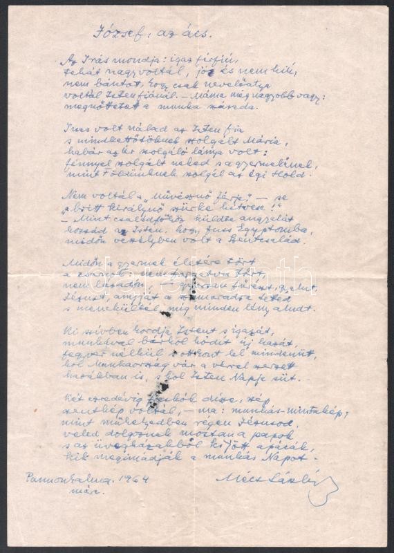 Beschreibung: 1964 Pannonhalma, Mécs László (1895-1978) premontrei szerzetes, költő "József, az ács" c. (kiadatlan) versének autográf kézirata, aláírásával