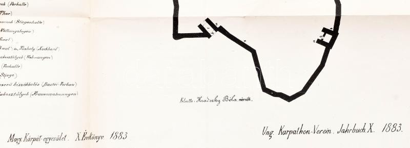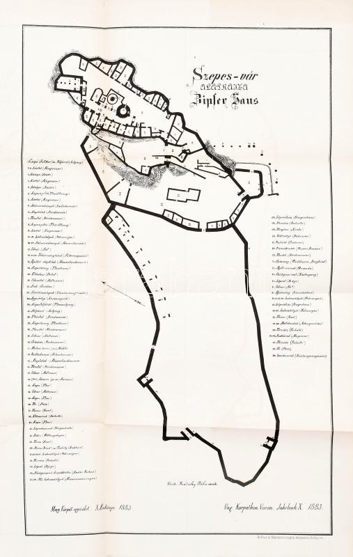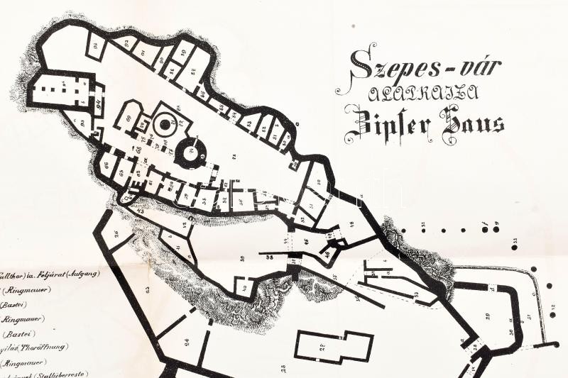 1883 Szepes-vár alaprajza, Zipser Haus,(Szepesi vár, Spissky hrad, Zipser Burg), felvette: Hradszky Béla, Magyar Kárpát Egyesület X. évkönyve 1883, Bp., Kellner és Mohrlüder-ny., hajtott, 49x31 cm / 1883 Map of Spissky hrad (Szepesi vár, Zipser Burg, 49x31 cm