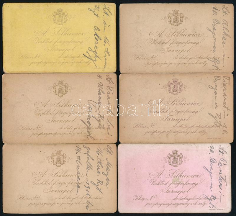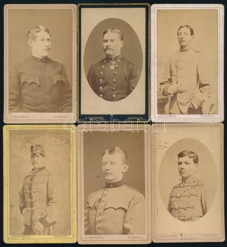 cca 1890 6 db katona feliratozott vizitkártyája, rajta a rendfokozat és az egység megnevezésével: huszár, ulánus, dragonyos, stb. / 6 soldier cdv photos with ranks and units