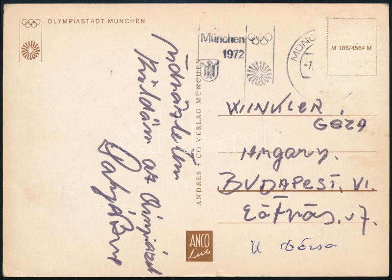Beschreibung: 1972 Polyák Imre (1932-2010) olimpiai bajnok birkózó által aláírt képeslap a Műncheni olimpiáról / Olympic champion wrestler autograph postcard