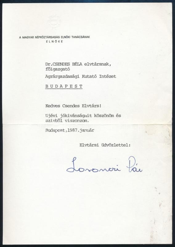 1987 Losonci Pál államfő autográf aláírása hivatalos levélen https://www.darabanth.com/de/39-Gross-Auktion/39.1/Kunst-Skulpturen-Historische-Dokumenten/Signatur~16379/1987-Losonci-Pal-allamfo-autograf-alairasa-hivatalos-levelen~II2725390
