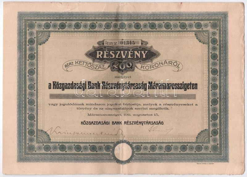 Máramarossziget 1911. "Közgazdasági Bank Részvénytársaság Máramarosszigeten" részvénye 200K-ról, szelvényekkel, szárazpecséttel T:II- kis ragasztás / Máramarossziget 1911. "Economic Bank Share Company Máramarossziget" share about 200 Korona with coupons and embossed stamp C:XF small sticking