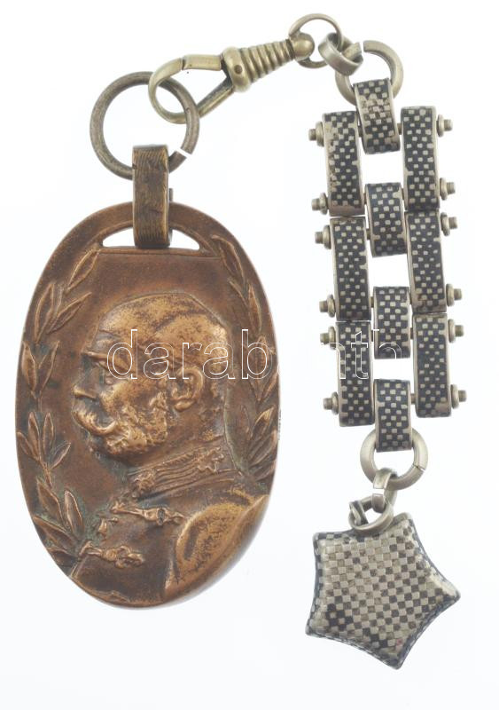 Hungary 1915. "Franz Joseph / October 3-4 1915 - Budapest" two-sided bronze War Exhibition Medal on a chain, with "WIRTH" maker's mark on the edge (50x32mm) C:XF patina