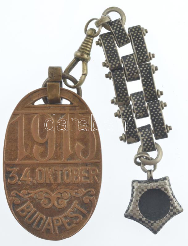 1915. "Ferenc József / 1915. október 3-4. - Budapest" kétoldalas bronz hadi kiállítási érem lánccal, peremén "WIRTH" gyártói jelzéssel (50x32mm) T:2 patina /