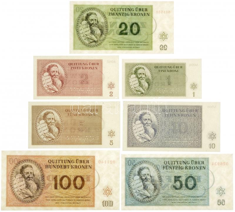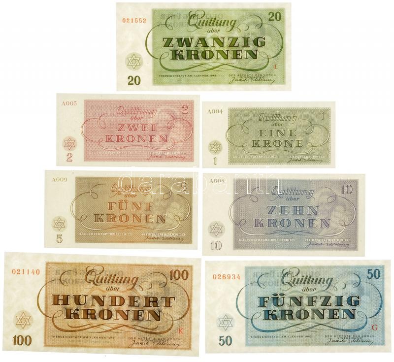 Német Harmadik Birodalom / Cseh-Morva Protektorátus / Theresienstadt gettó 1943. január 1. 1K "A 004" + 2K "A 005" + 5K "A 009" + 10K "A 008" + 20K "L 021552" + 50K "G 026934" + 100K "K 021140" helyi pénz T:I / German Third Reich / Protectorate of Bohemia and Moravia / Theresienstadt ghetto 1st January 1943. 1 Krone "A 004" + 2 Kronen "A 005" + 5 Kronen "A 009" + 10 Kronen "A 008" + 20 Kronen "L 021552" + 50 Kronen "G 026934" + 100 Kronen "K 021140" local paper money C:UNC