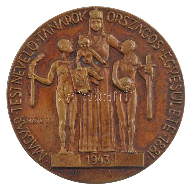 Magdányi Antal (1902-?) 1943. "Magyar Testnevelő Tanárok Országos Egyesülete" bronz érdemérem (64,5mm) T:1- patina, kis ph. / Hungary 1943. "National Association of Hungarian Physical Education Teachers" bronze medal of merit. Sign: Antal Magdányi (64,5mm) C:AU patina, small edge error